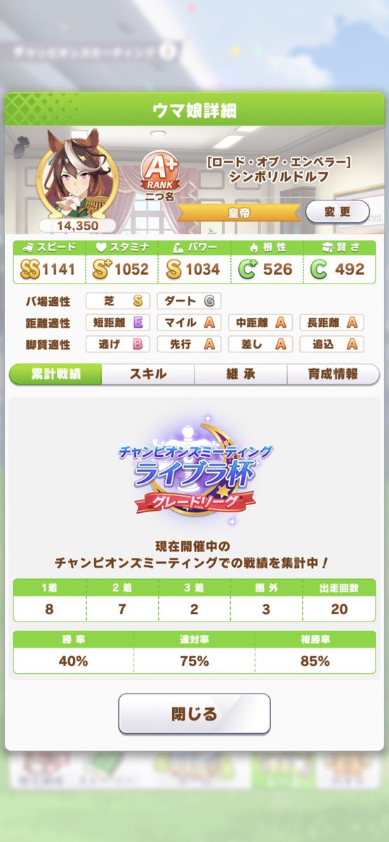初日はルドルフ7、ドトウ7、カフェ4の20戦18勝。とりあえずカフェの更新目指すかな。