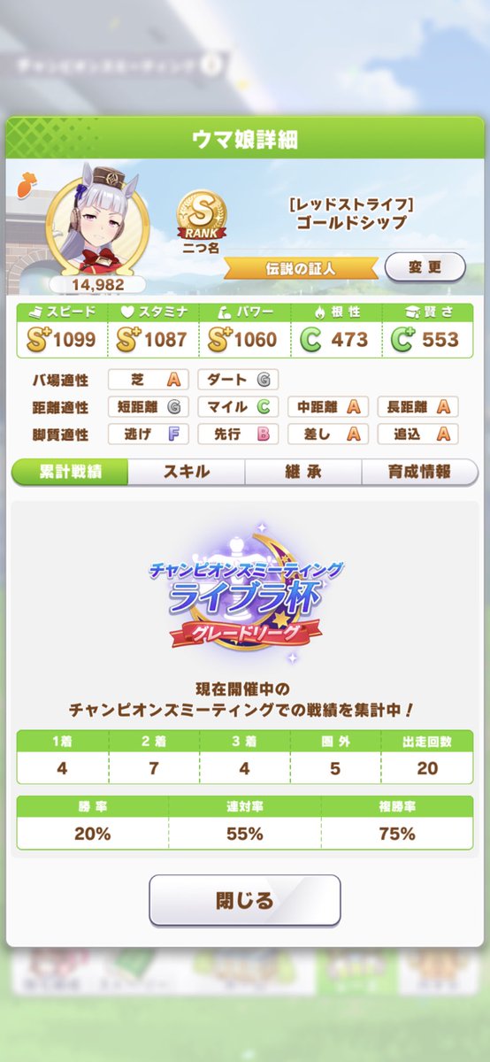 追込会長はやはりハマれば強い。A+だけど相手S+とかでも汝なんとかで差し切れる(はまれば
