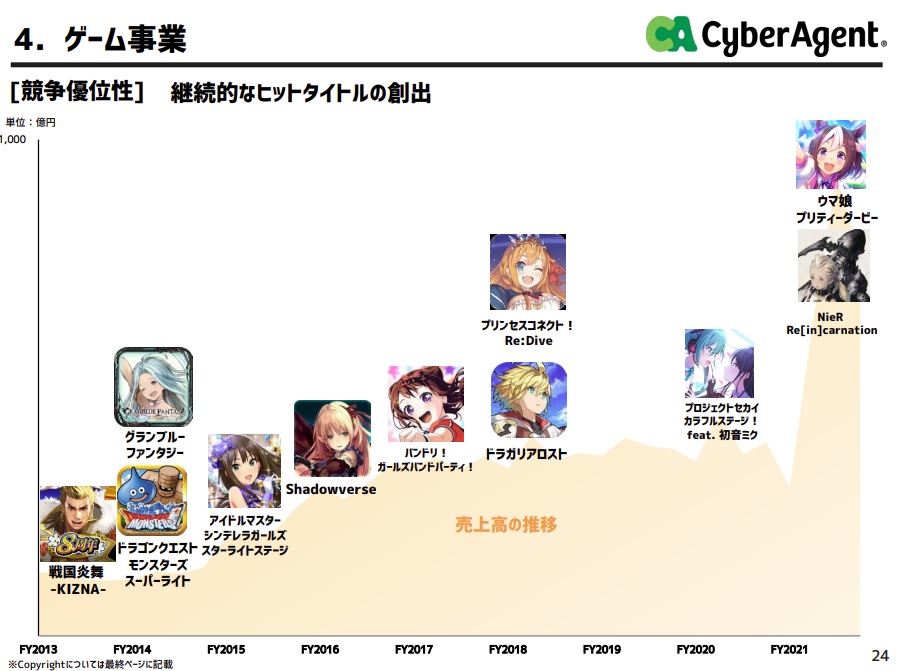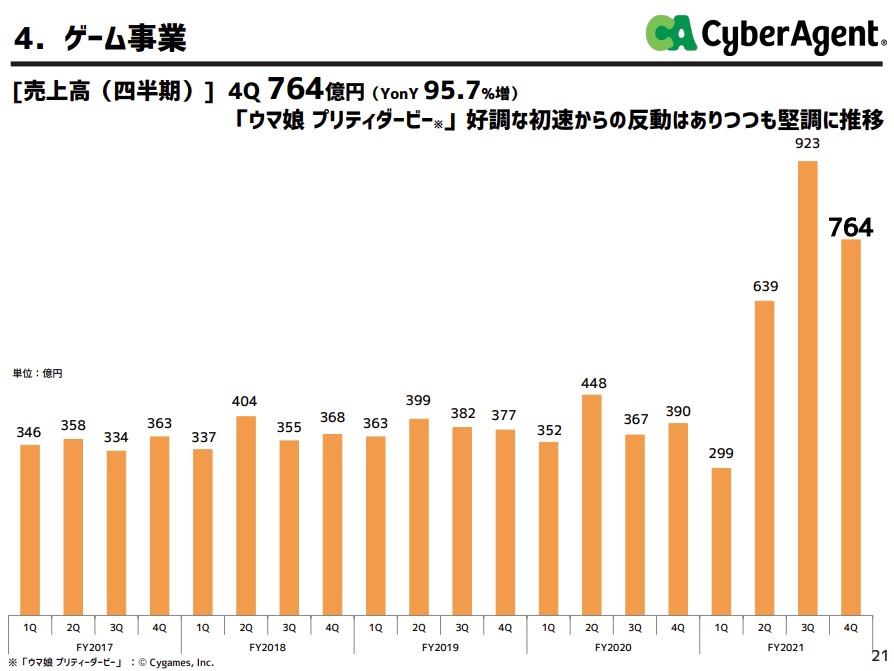Cygamesの運営する『ウマ娘プリティーダービー』の運営成績が貢献し、過去最高業績となった。