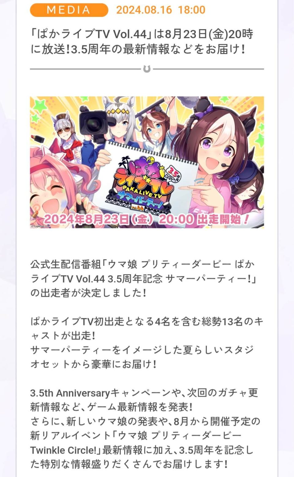 総勢11名のキャストが、“夏祭り”をイメージした豪華なスタジオセットから番組をお届けします!番組内では、新たなウマ娘や4.5th Anniversaryキャンペーン、次回のガチャ更新情報など、ゲーム最新情報を発表!
