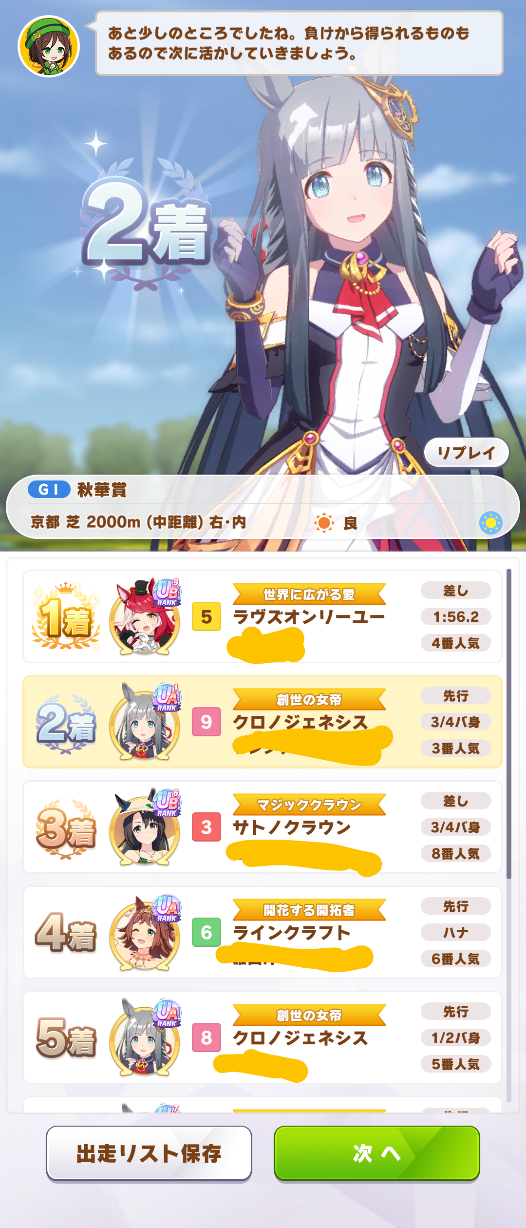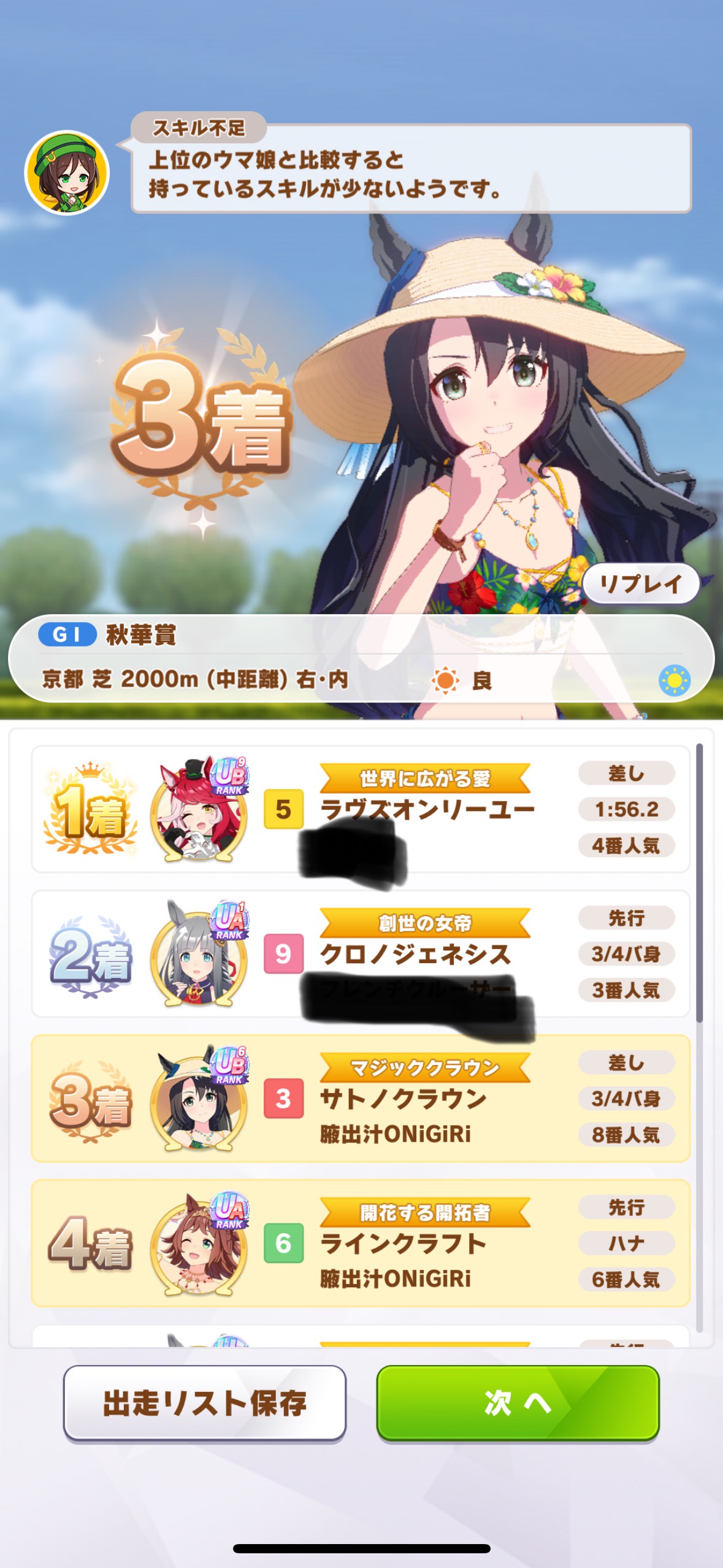 宝塚走った大逃げ2と仮育成のクロノで15戦ほど走ってみた。主な目的は宝塚より台頭してくるはずの差し勢をメタれるかどうか。宝塚の時は大逃げ2出しとけばオルフェは全く怖くなく相手はほぼクロノ(とドンナ)だけだったし、大逃げ自体の勝率もよかった。ルムマの結果は大逃げ2勝クロノ4勝。やった感じオルフェは蚊帳の外で差しにも多少効果ある感触だった。おそらくクロノドンナ配布クラフト辺りで勝つつもりなら、大逃げで牽引しないと今回はオルフェだけでなくユニポッケやメサイア、衣装カワカミあたりもかなり脅威になると思う。