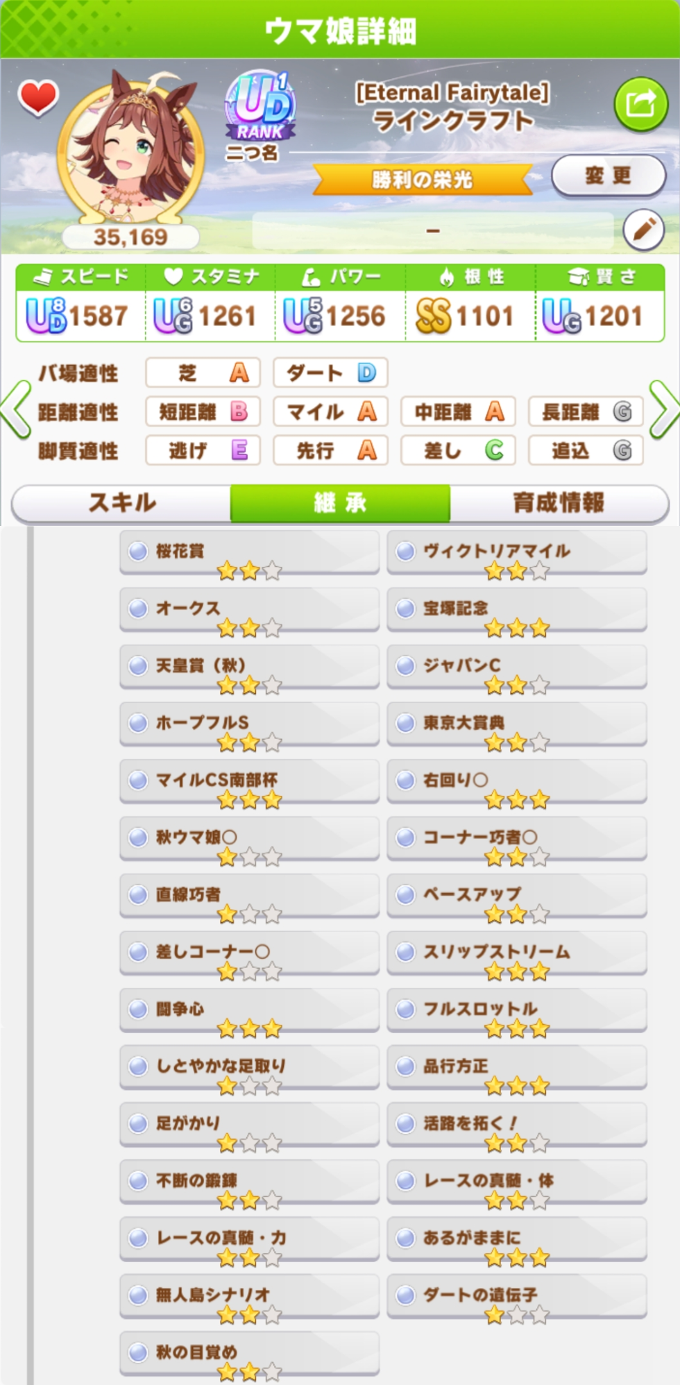 • 右3ペースアップ2闘争心3フルスロ3品行方正3に体力もあってあるがままにも3あるのに内容が良くないって、一体因子から何のスキルを取るつもりなのか?