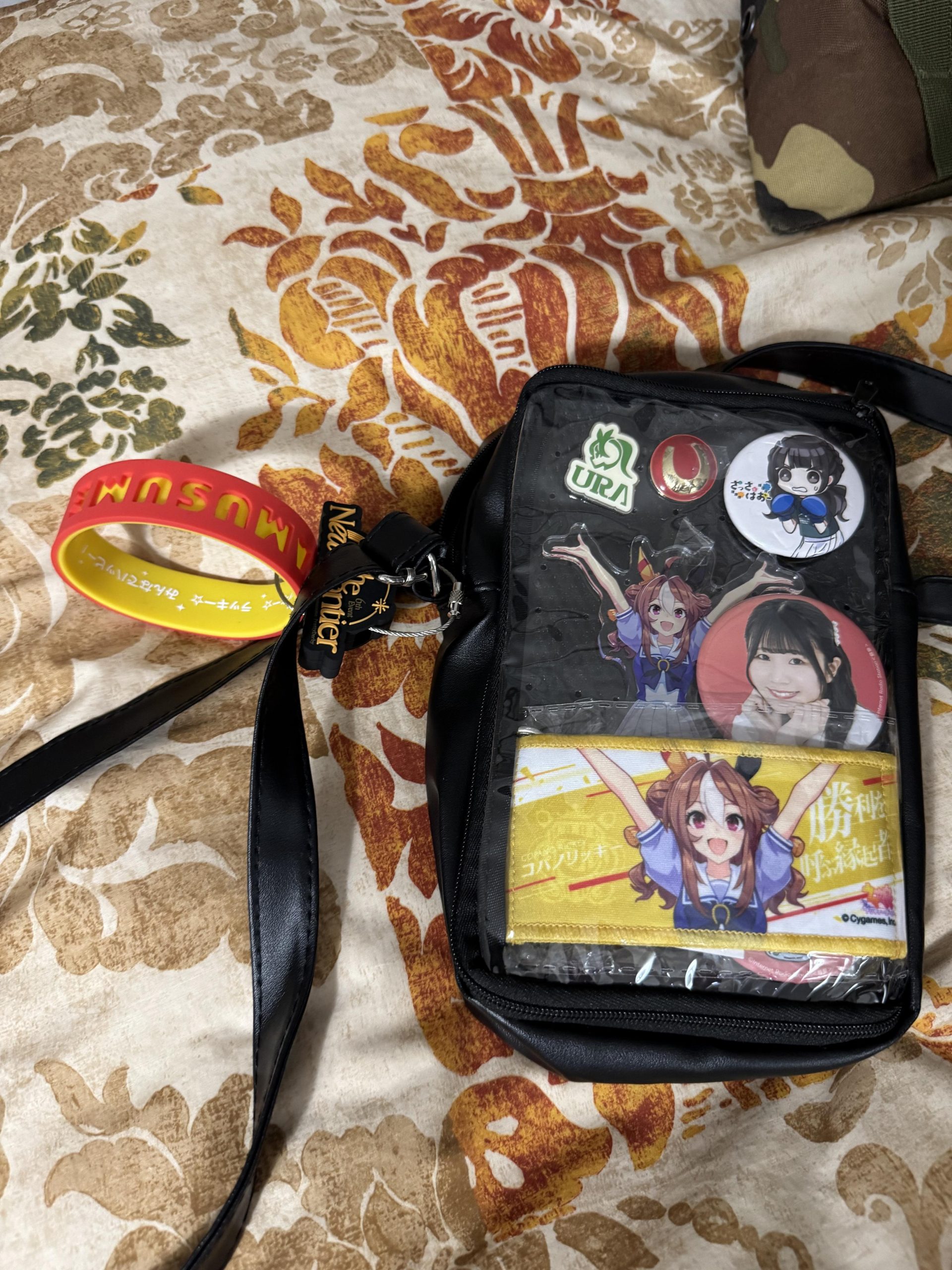 この痛バックはダイソーで売ってるやつだけど、ウマプレート2本入れられて便利やで