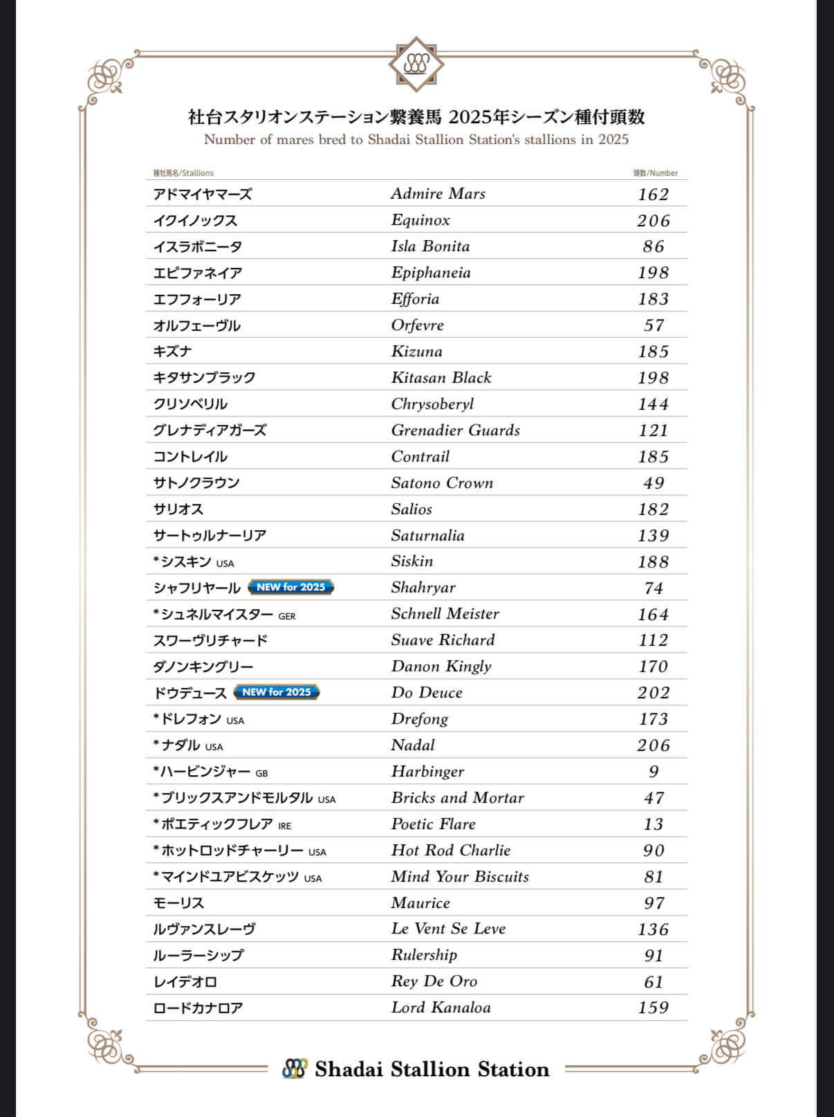 【競馬】社台SS繋養馬 2025年シーズン種付頭数発表