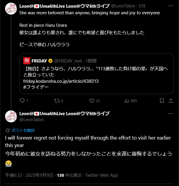 ウマ娘公式も訃報をつぶやいたね