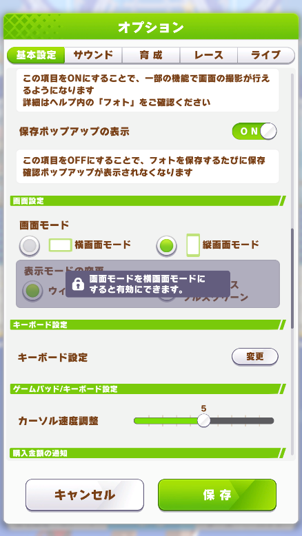 [メニュー]>[オプション]>[基本設定]からキーボード設定ができます。・横画面レース中にスキルカットインを再生