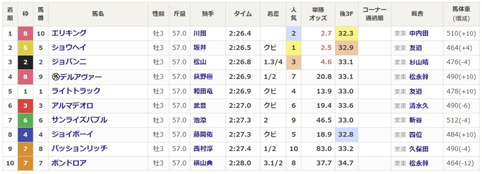 中々強い勝ち方だった…んだけど、キズナ産駒でトライアルの中内田、ダメ押しに長距離の川田だから菊花賞は戦う前から負け確レベルっていう…