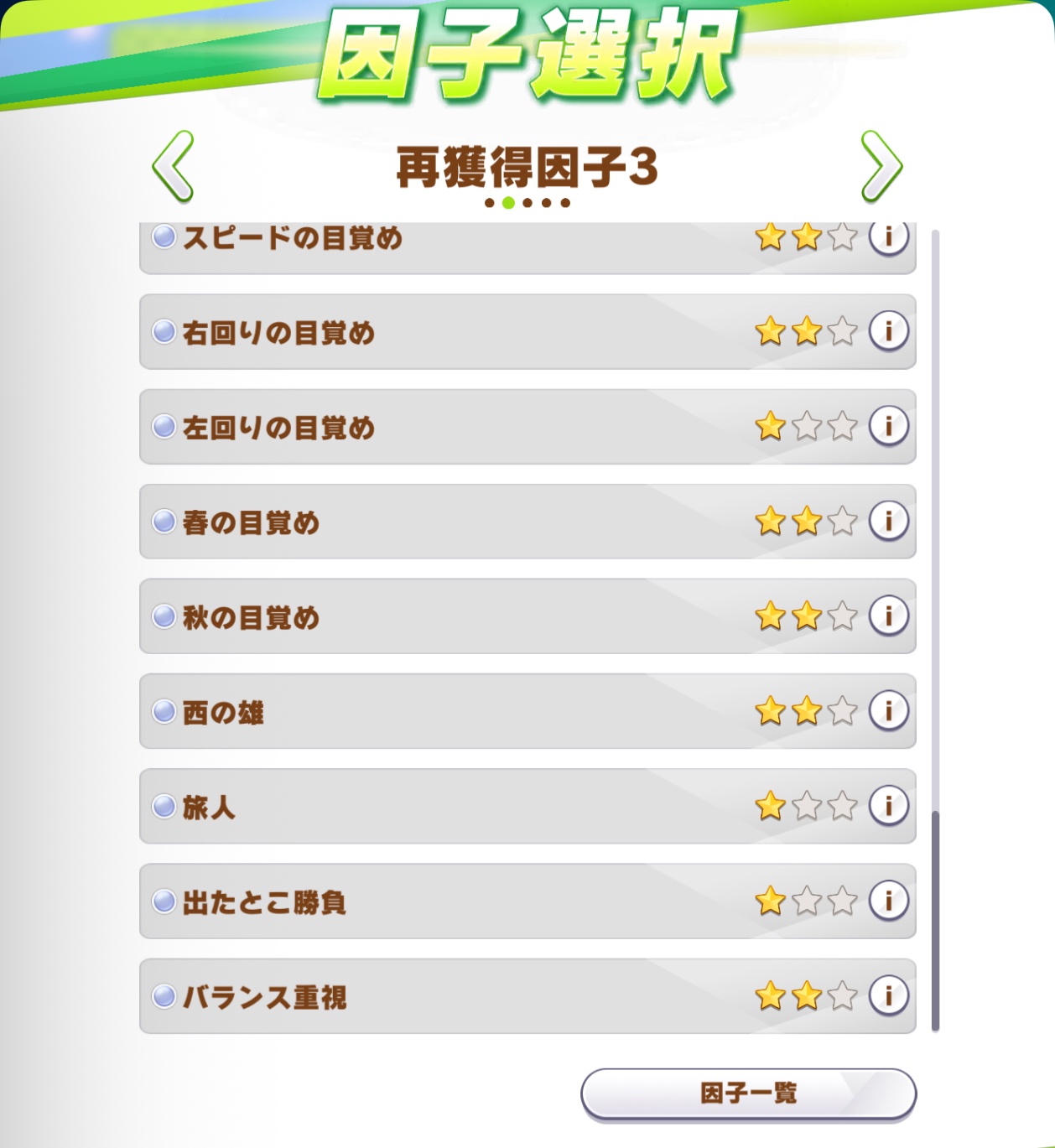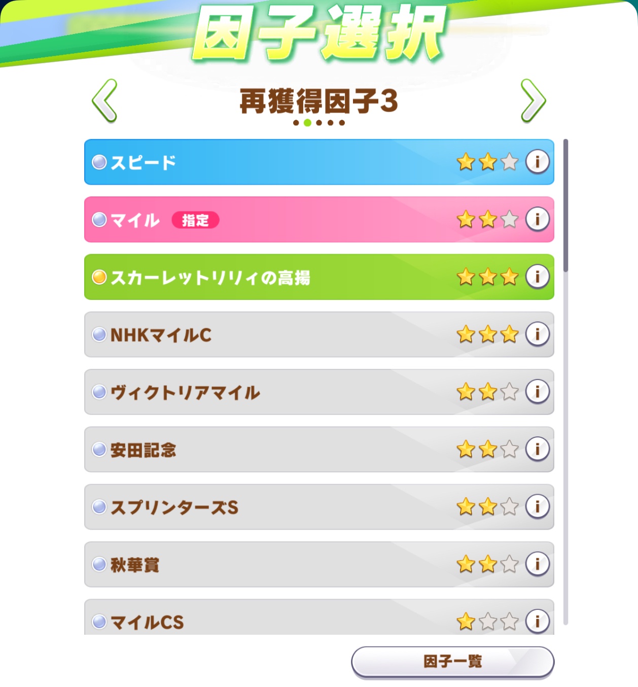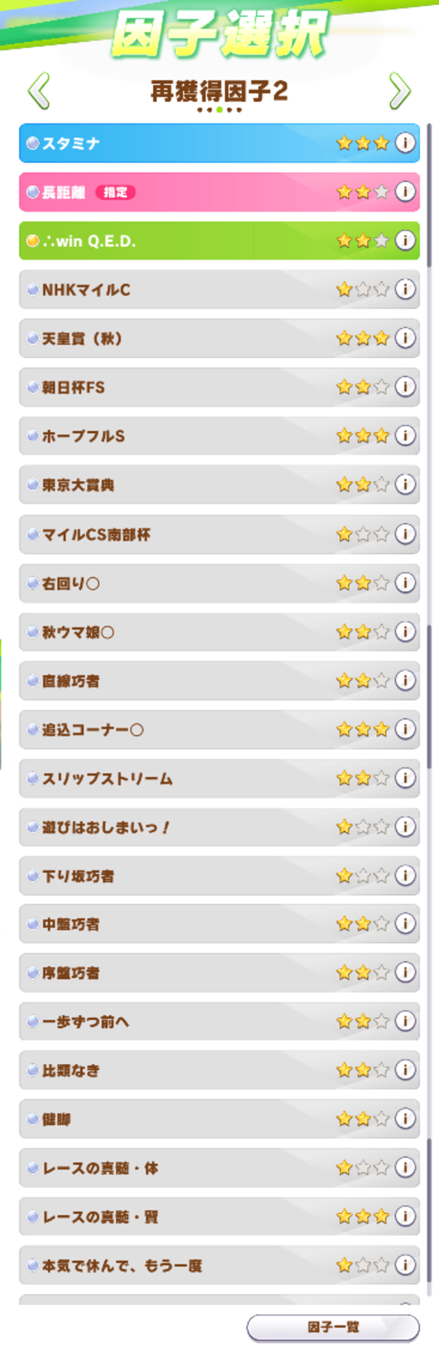 バーが緑の上まで来てて1ページ目からスキル因子始まってると緊張してくる
