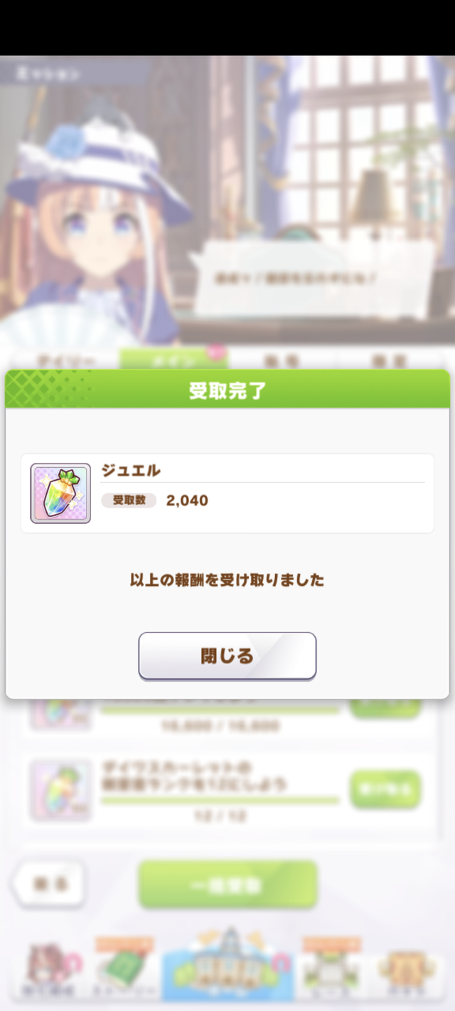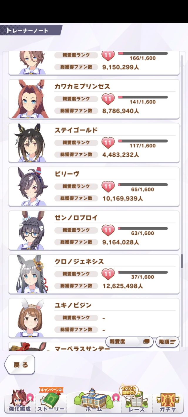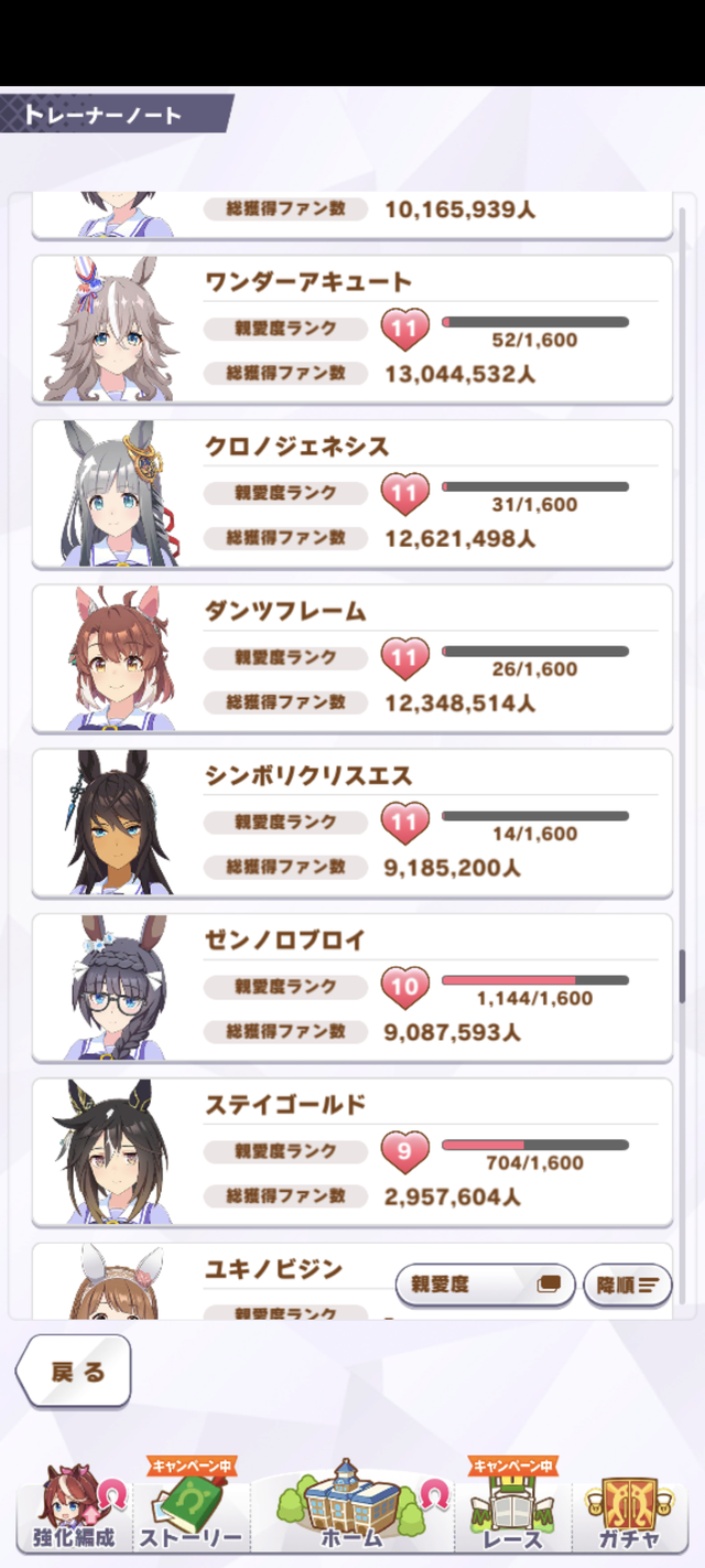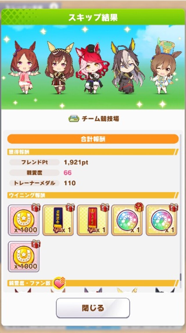 5. 自分はハニバ以前のキャラは報酬倍化の間に親愛度12にしたのでWIN確が来るまでゼリーは温存するわ、とりあえず500はステゴにぶっぱする