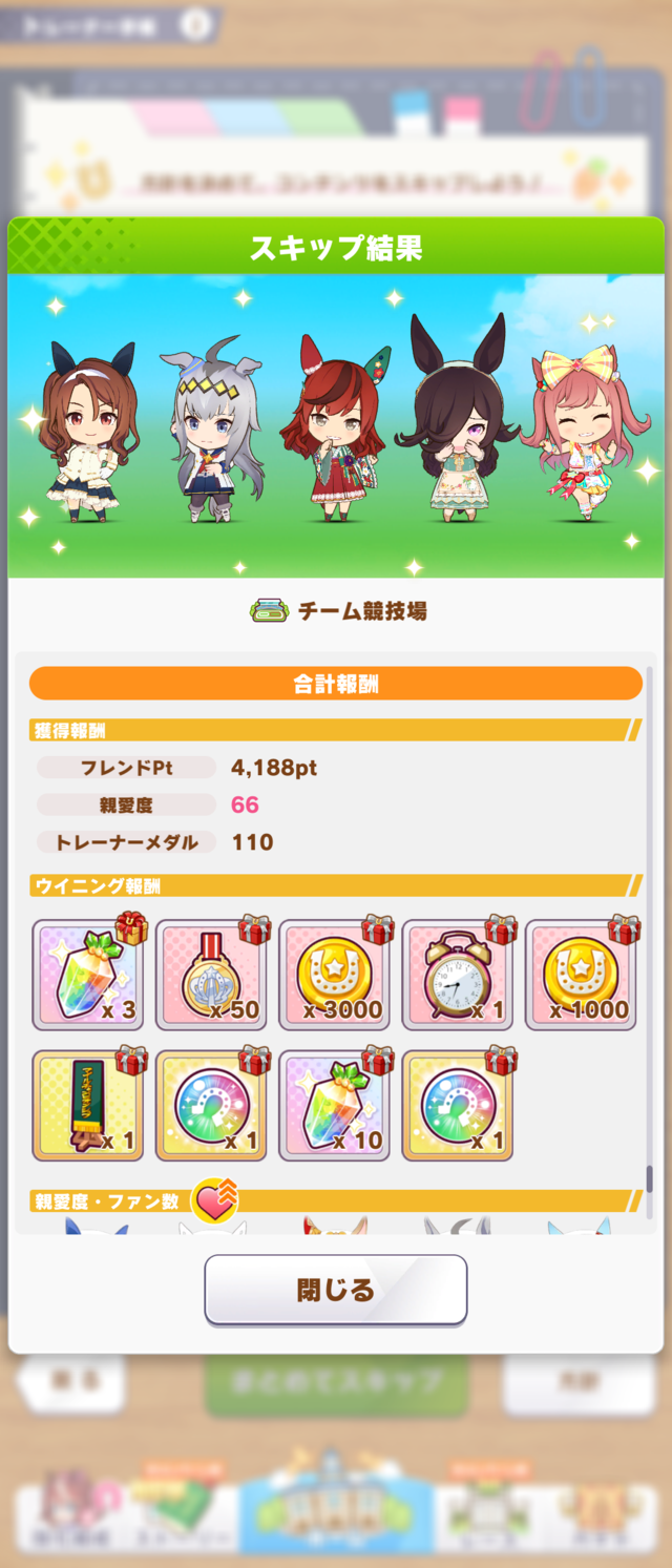 ゼリー11個でスキップすれば全勝で親愛度66貰える
