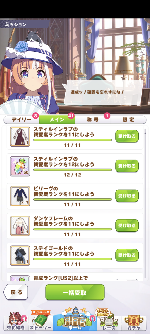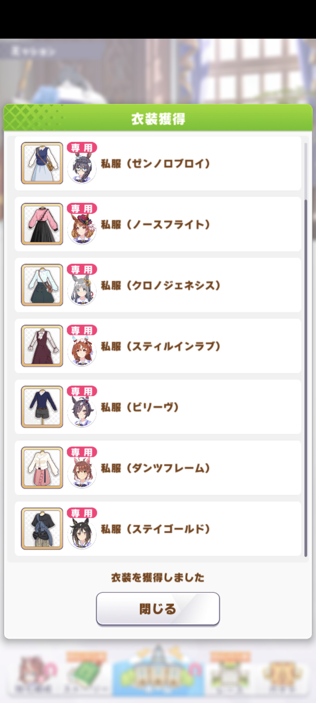 ドリンクがぶ飲みしてステゴの私服と手持ちの親愛度全員11まで上げ終わった