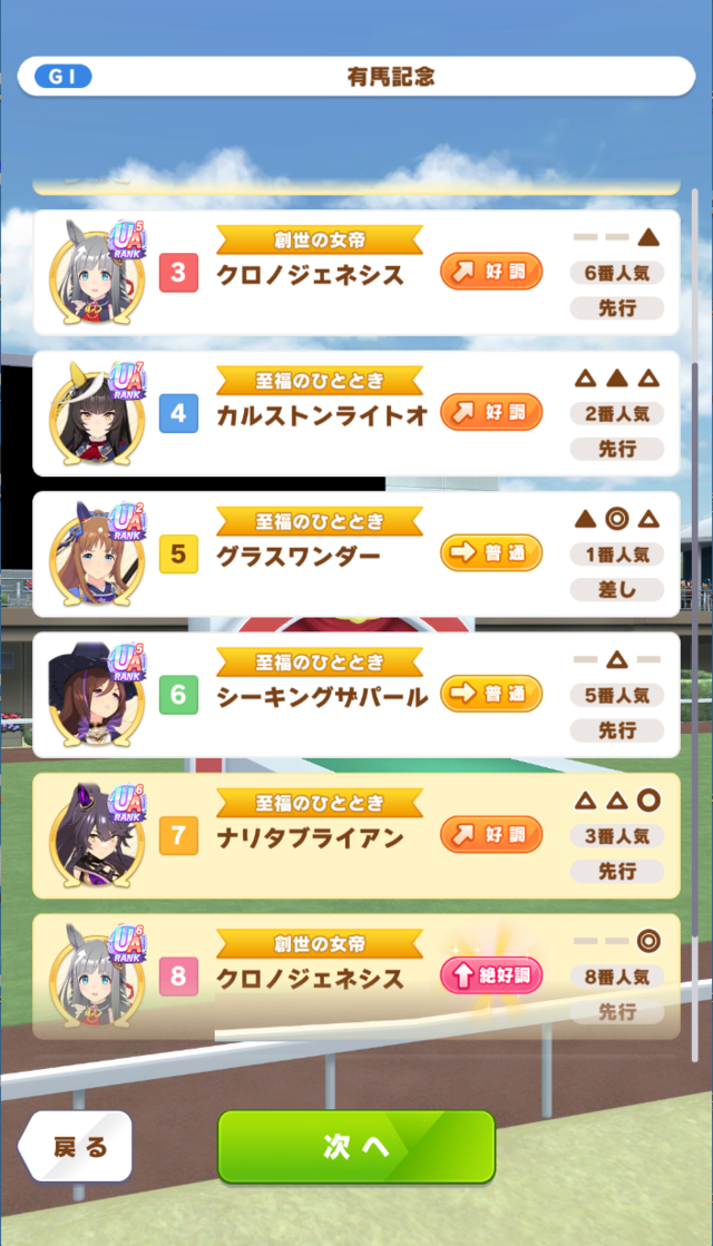 3. 今回は大逃げターボ逃げマチタン先行ネイチャで作ってたけど、マチタンもやっぱ今回は先行かと悩んでいる