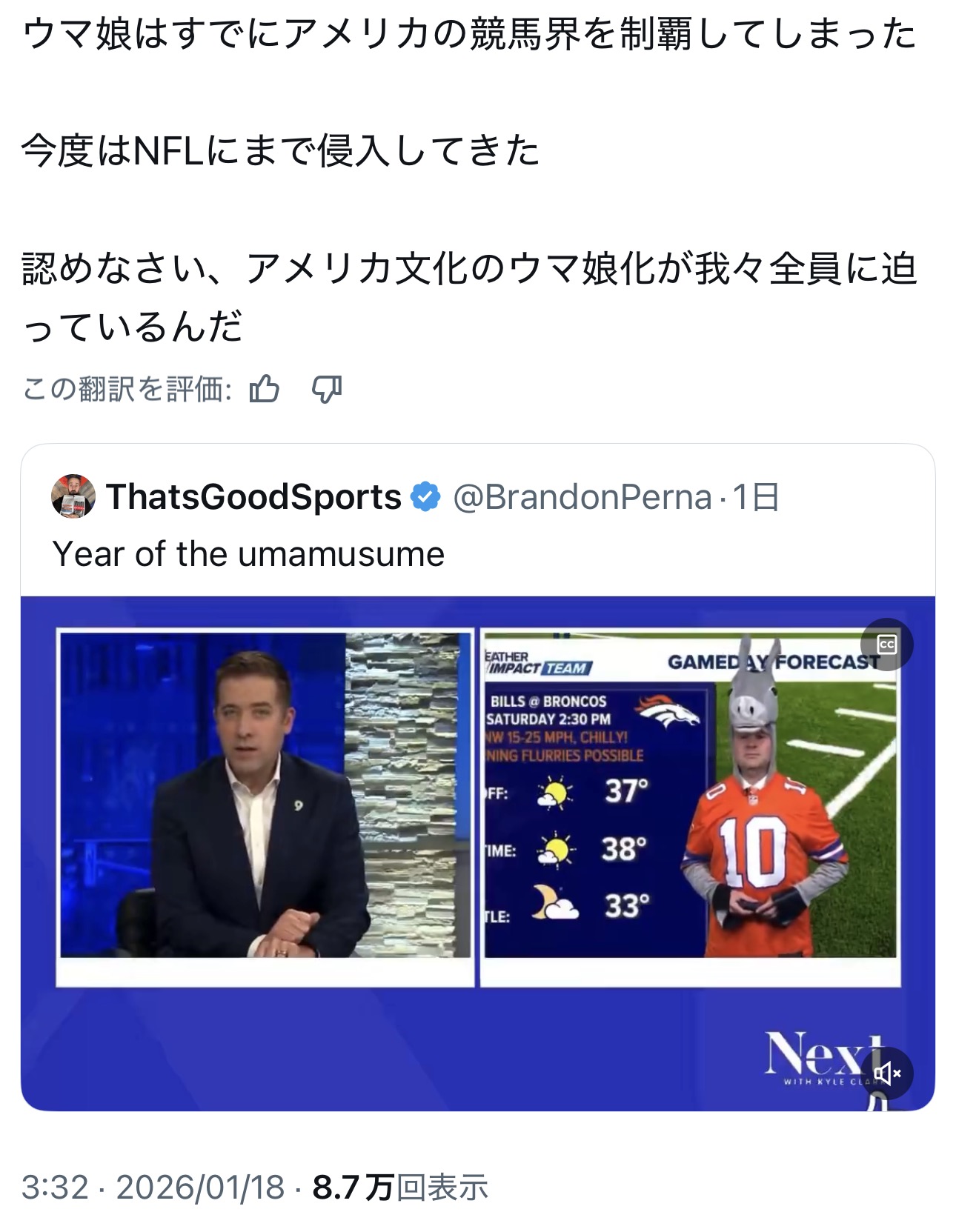 なんの繋がりがと思って調べたらデンバー・ブロンコスのマスコットがサンダーという実在馬だから…って事なのね