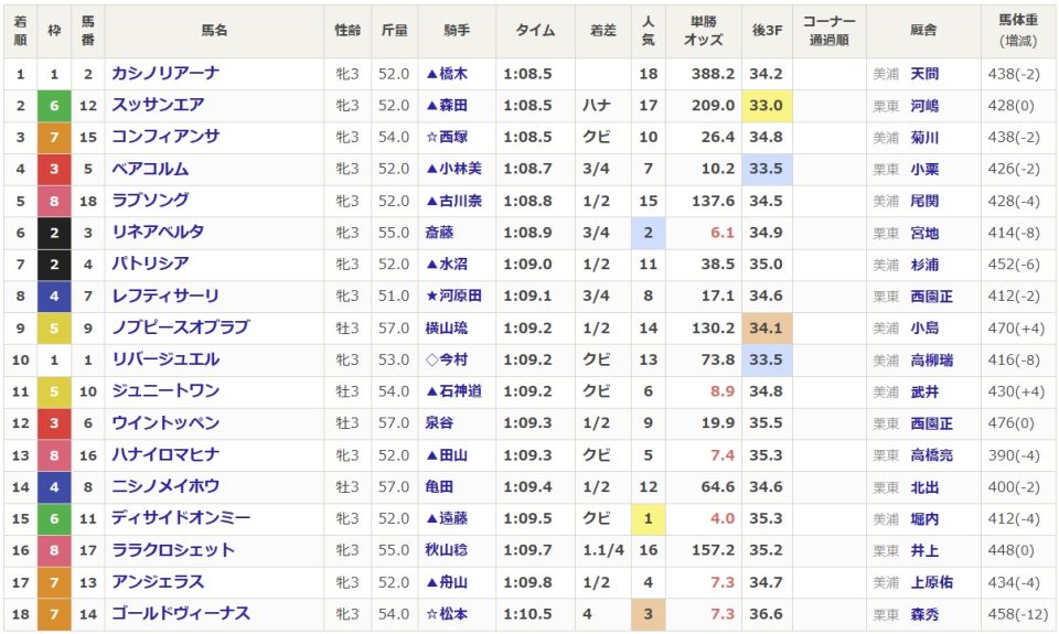 31日の小倉6R3歳未勝利戦(芝1200メートル)の若手騎手限定競走で橋木騎乗の18番人気カシノリアーナが勝利。鼻差の2着に17番人気スッサンエアが入り、そこからさらに首差の3着に10番人気コンフィアンサが入った。