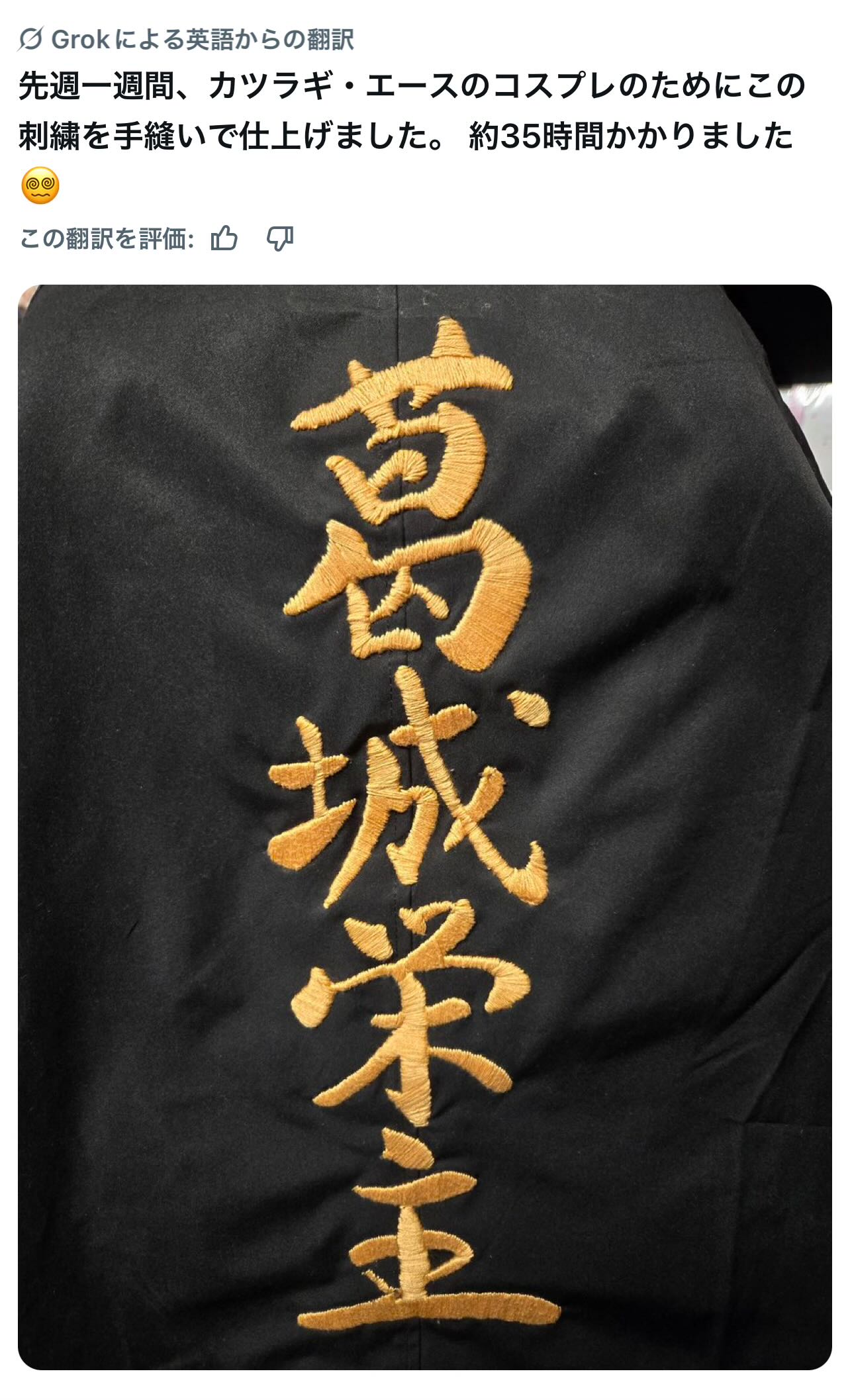 Just spent the last week hand-stitching this embroidery for my Katsuragi Ace cosplay. Took about 35 hours 😵💫 pic.twitter.com/5faqO5nWrq