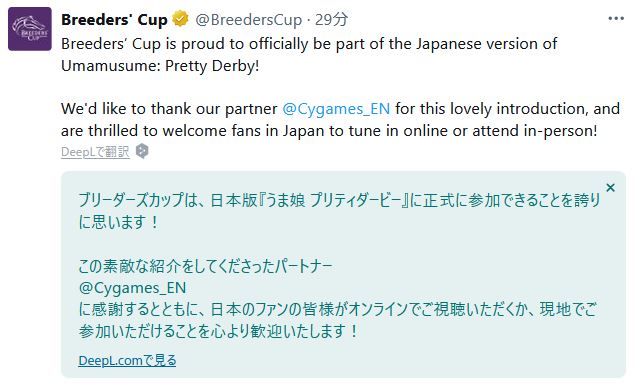 ブリーダーズカップ公式アカウントがウマ娘の告知するの、すごい時代になったな…。