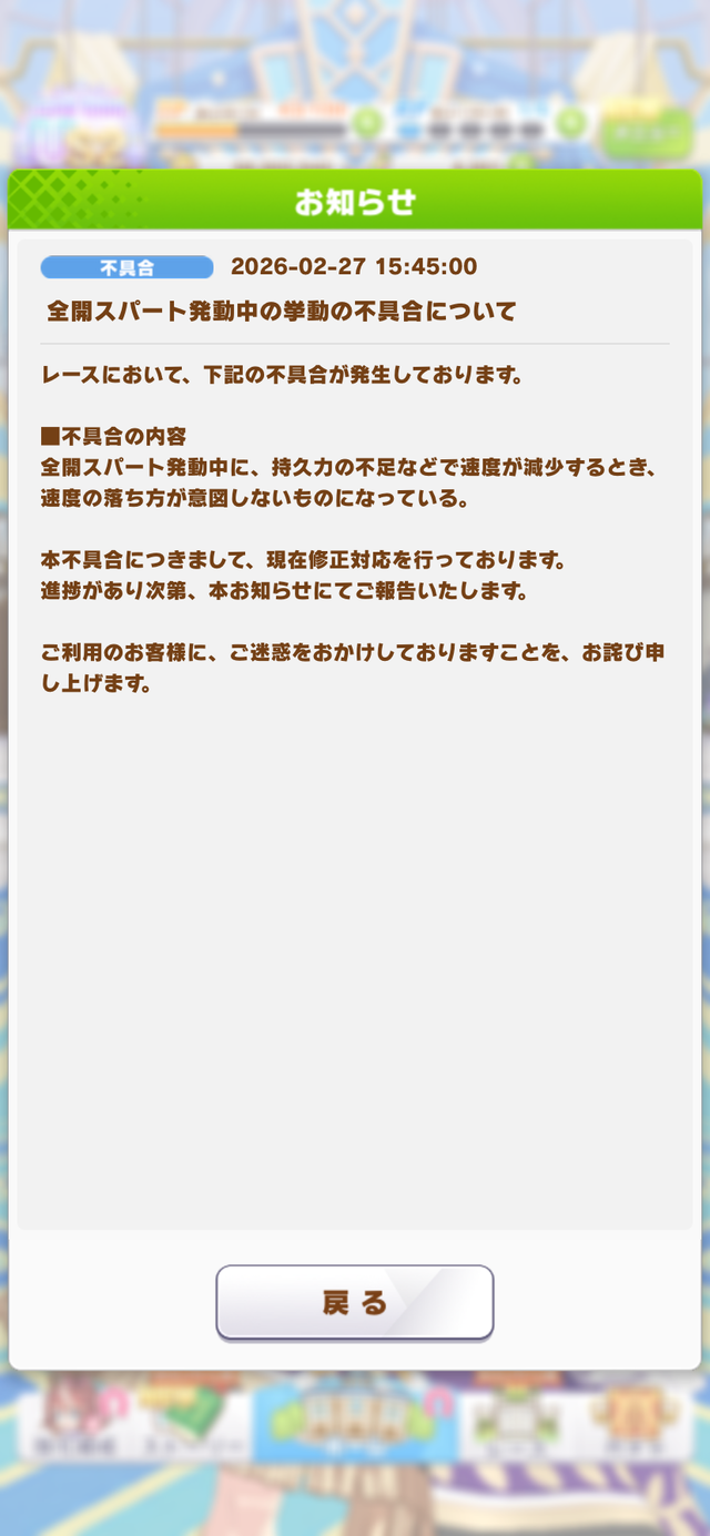 全開スパート発動中に、持久力の不足などで速度が減少するとき、速度の落ち方が意図しないものになっている。本不具合につきまして、現在修正対応を行っております。