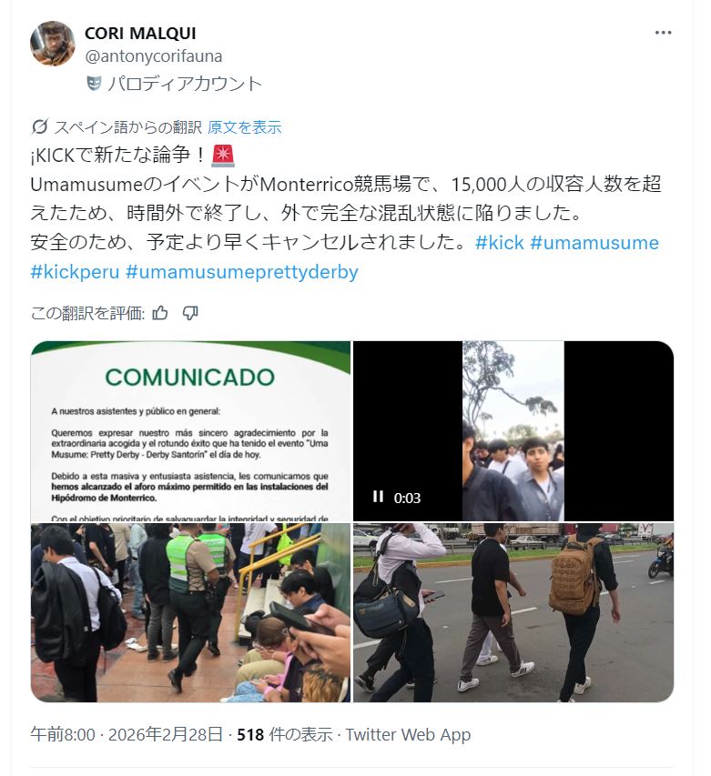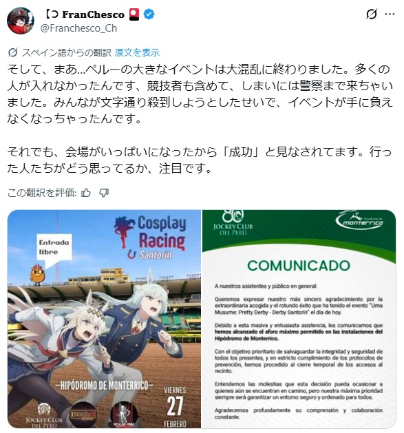 ペルーのウマ娘イベント人来すぎで入れなくて騒ぎになって警察まで来たんですね
