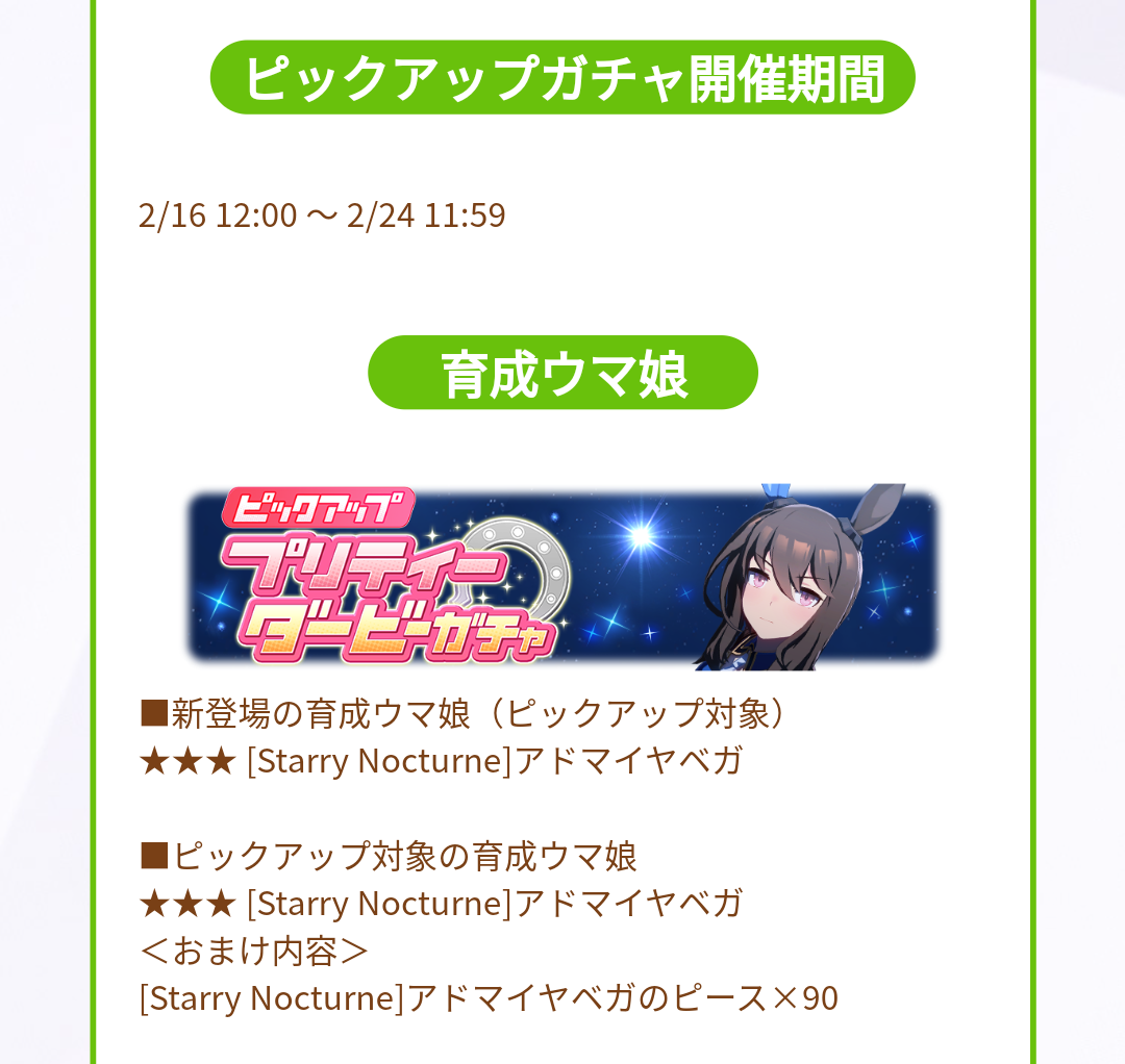 【ウマ娘】2月16日からのガチャは★3アドマイヤベガ!サポカピックはSSRファインモーションとカワカミプリンセス!このタイミングでのファインは一体何を意味するんだ!?
