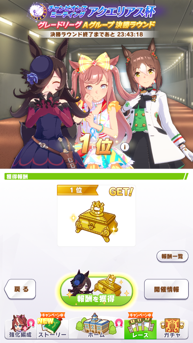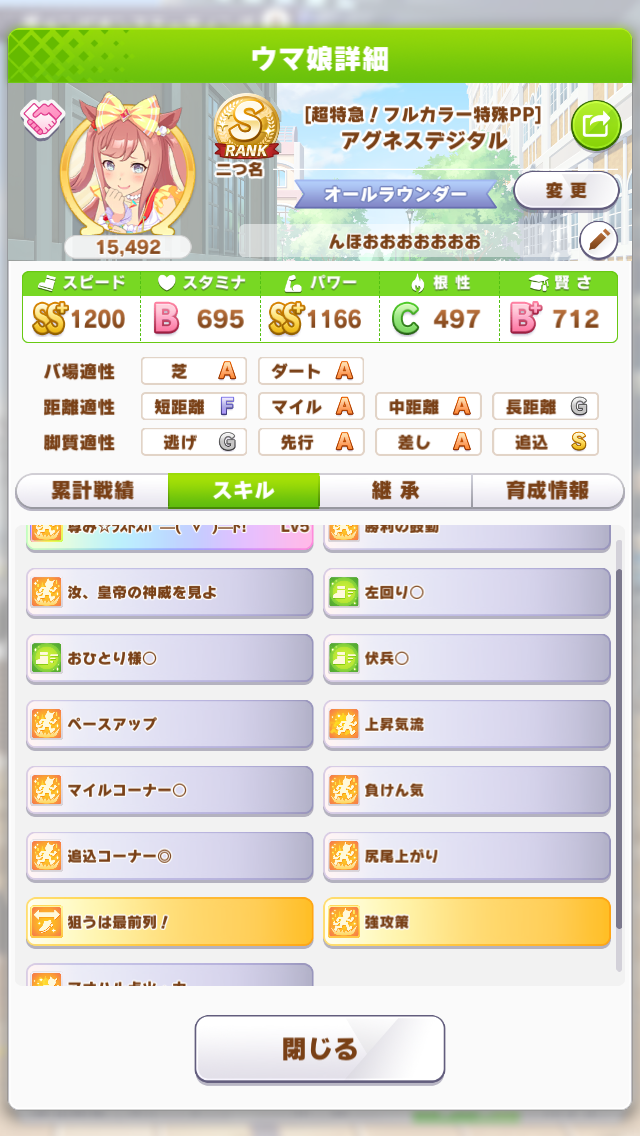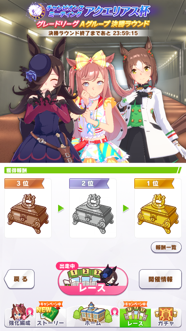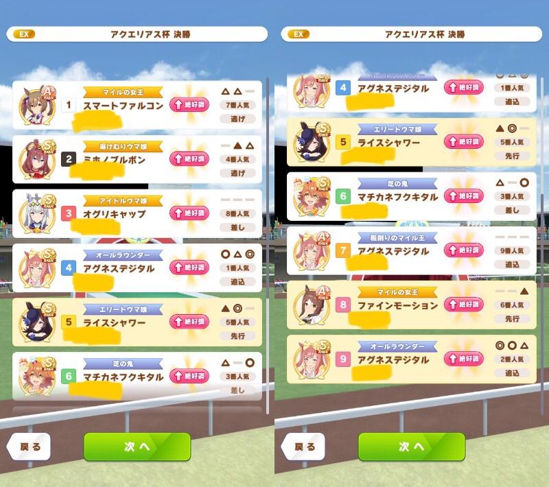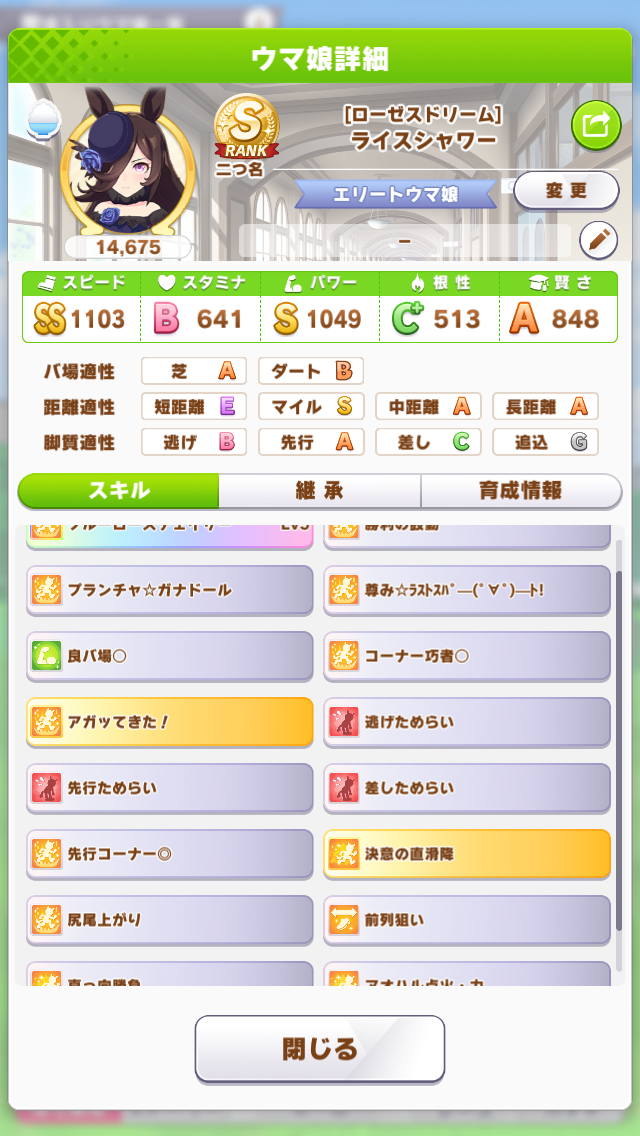 今回は決勝前日に仕上がったエリートライスを出走させる。中盤はそれなりに上がって終盤スキルとイバヤン秘伝のガンつけ全方位ためらいデバフを併用してぶっちぎるエリートヤンキースタイルだ!予選には一度も出していないのでルムマに何度か出走させたが、3回勝ってくれたので決勝でもぶっちぎってくれるだろう!