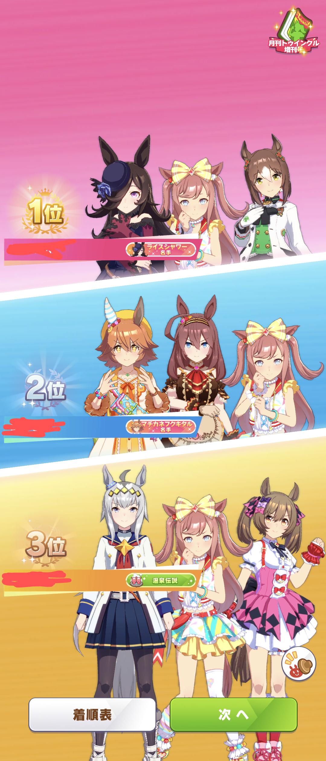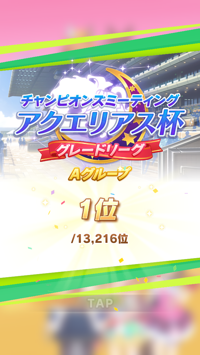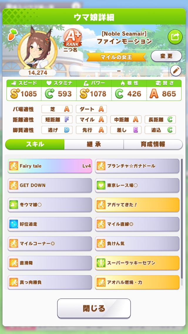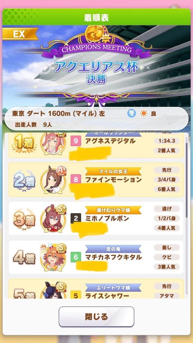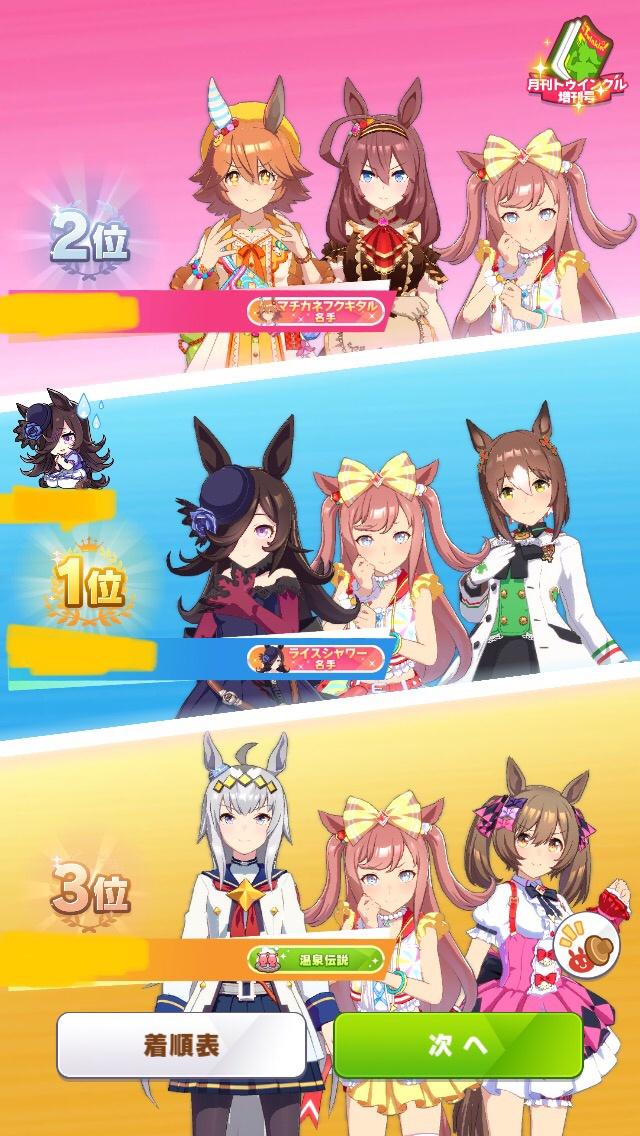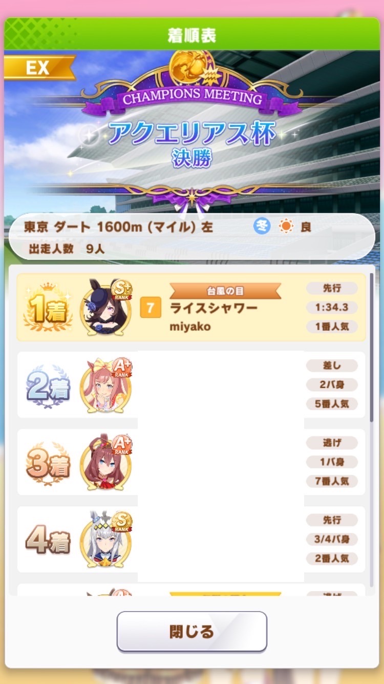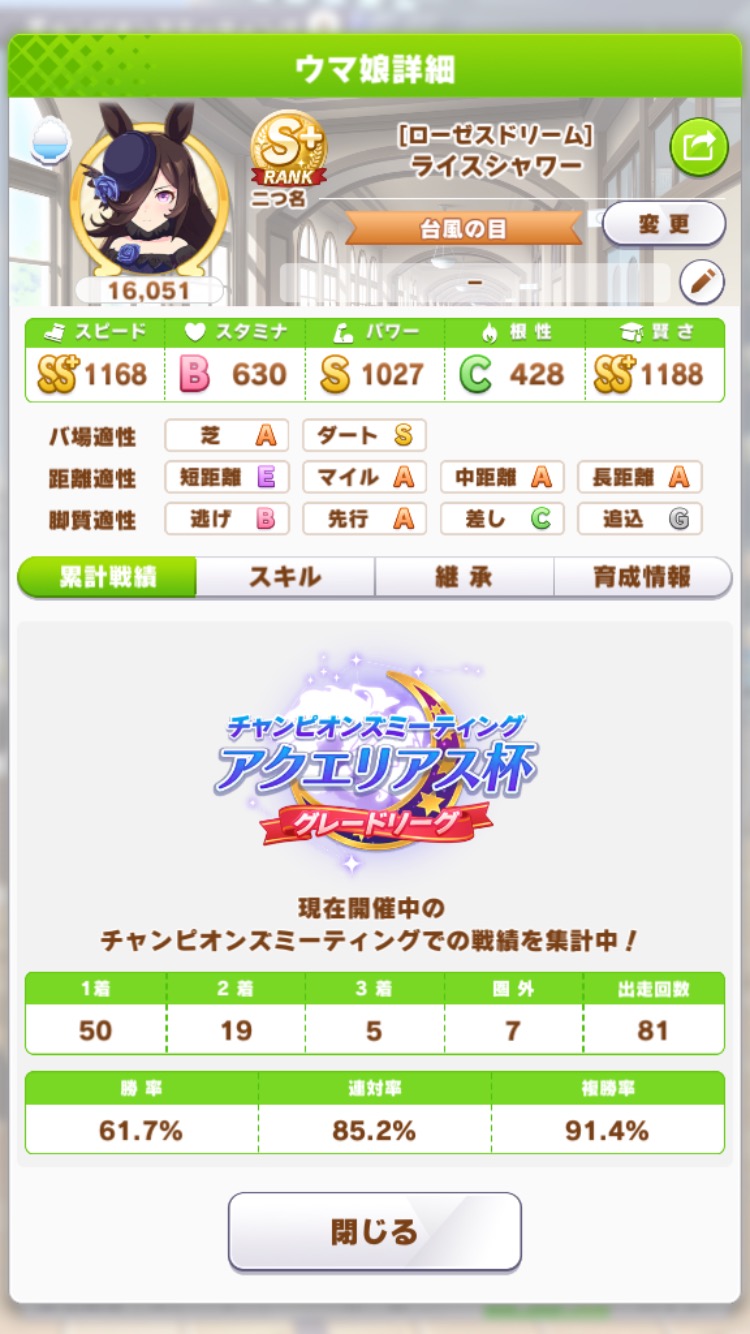 前回と同メンバーボーナス、ライスシャワー=ファインモーションなのでダブルライスボーナス等々も合わさりスキル有効発動率とちょうど良い感じの対戦相手を引く確率が大幅にアップしている!!