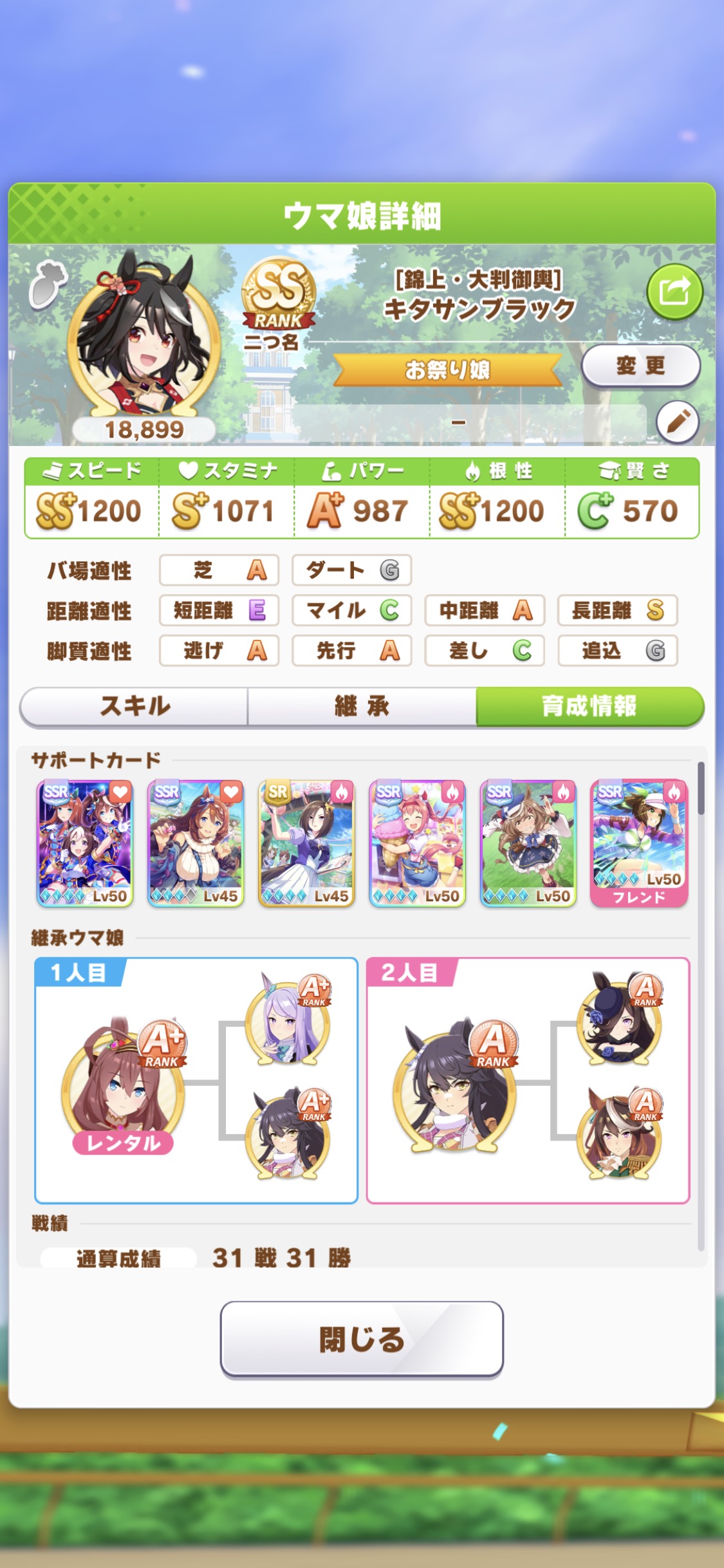 まぁそれだけだとまず追い込みに負けるから、先行にしてキタサン固有つけて運良く逃げ役の先行になれば勝てる