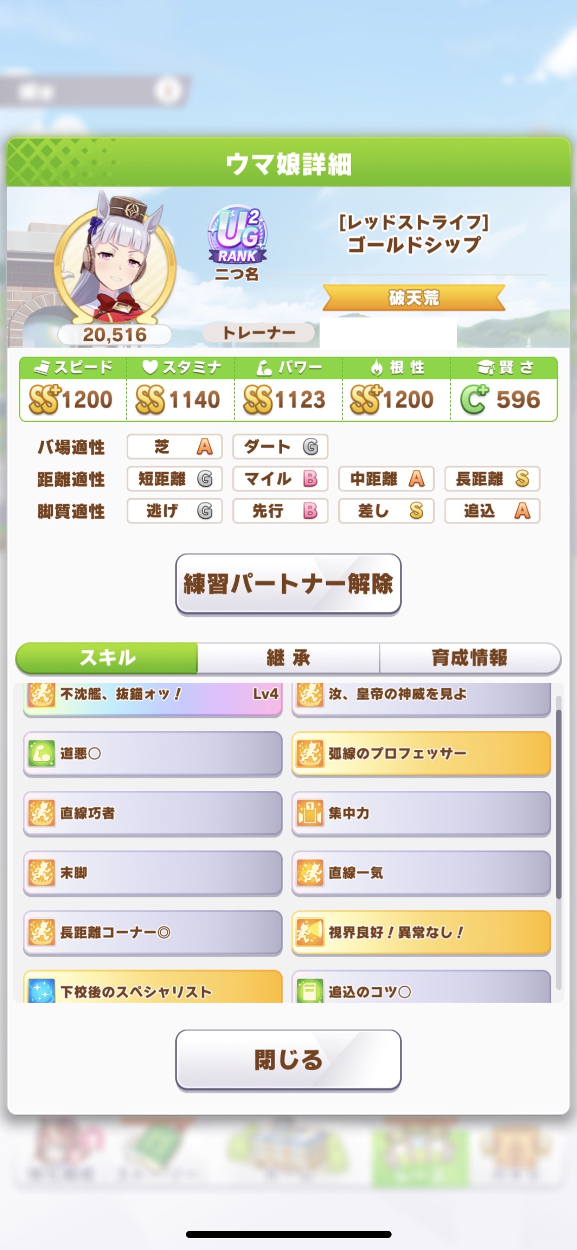 2回発動狙えるプロフェッサーとパワボ持ちが欲しかったんじゃない?ヒントもチャンミに欲しい長距離直線とコーナー回復持ってる上に練習性能高いから根性に混じっても良いし