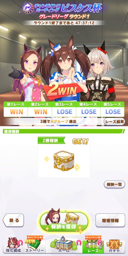 • 勝算無くても取り敢えず参加すんのが賢いでしょ。ちょっとレースするだけで石やらマニー貰えるのに。もったいな。