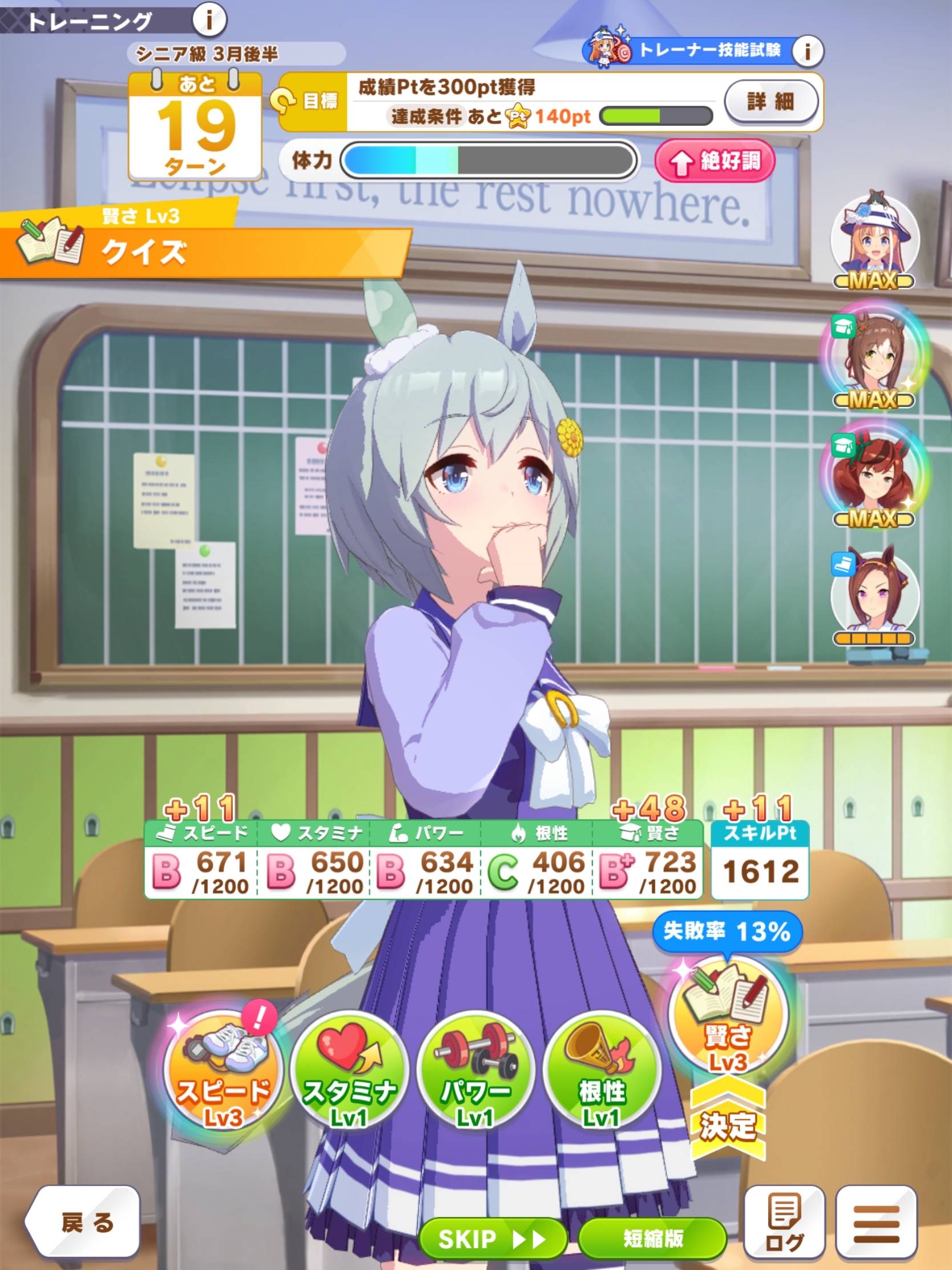 とりあえずマイル中距離、マイル中長距離、中長距離でそれぞれ称号ボーナスが最大限とれるローテーションは登録してるわ