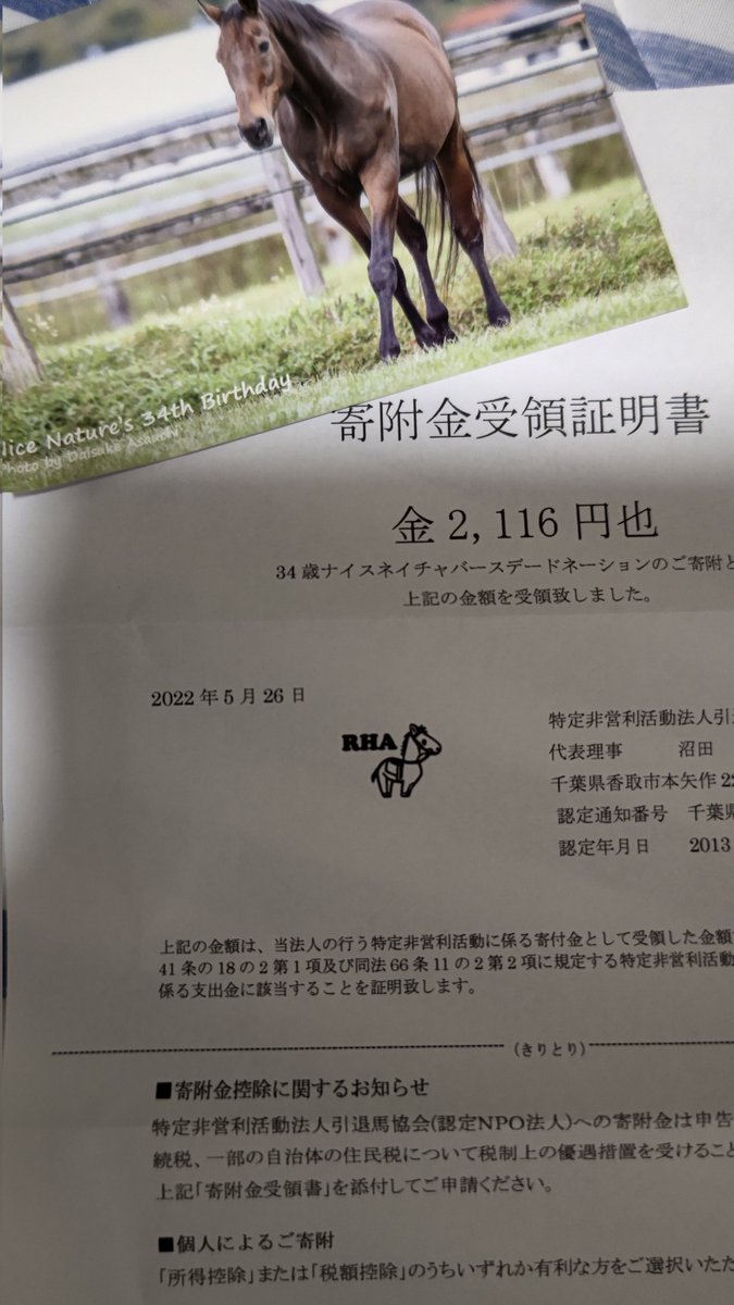 おお…引退馬協会から寄付金感謝状届いてる…。ナイスネイチャのポストカードありがとうございます。