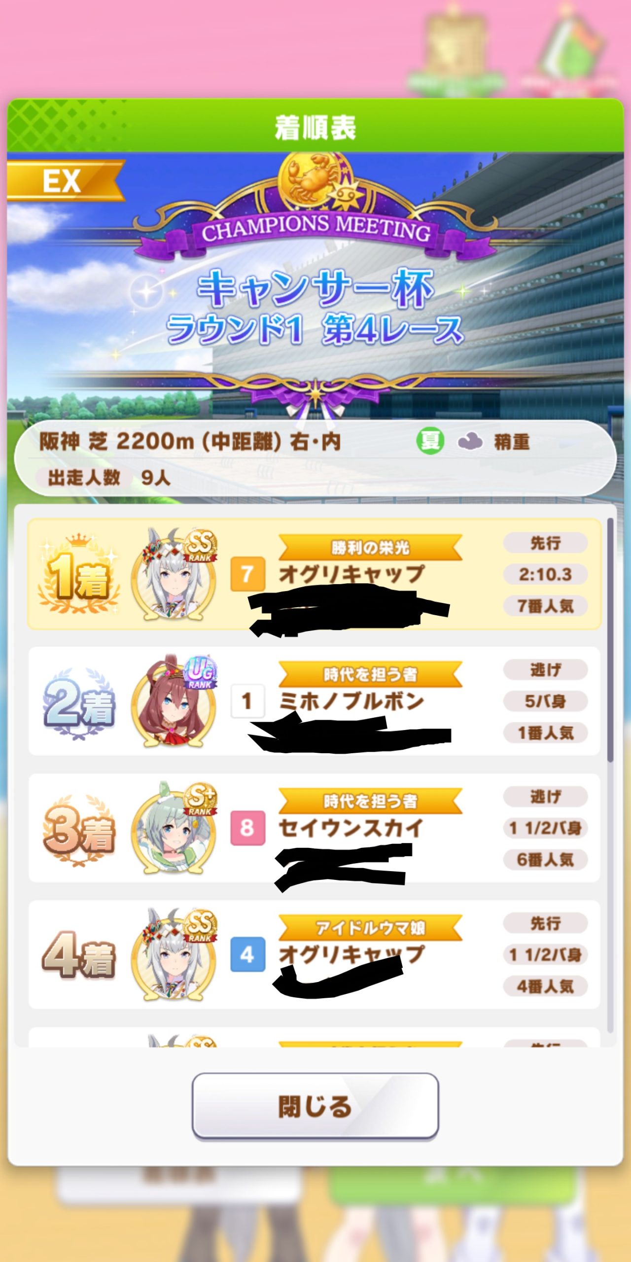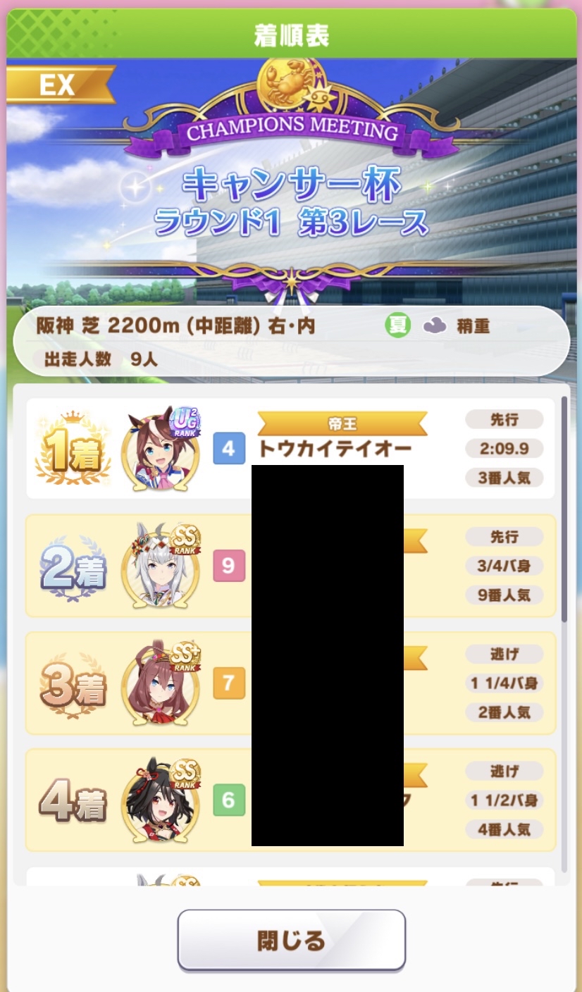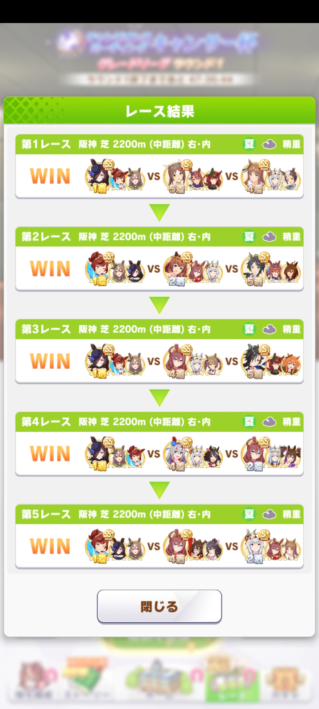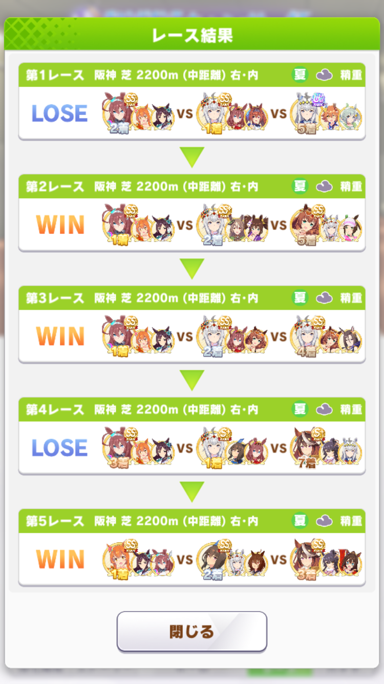 5. 取りあえず10戦やってクリオグリ4勝、ドーベル4勝、チアネイチャ1勝の9勝だな