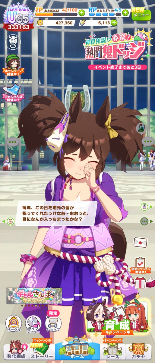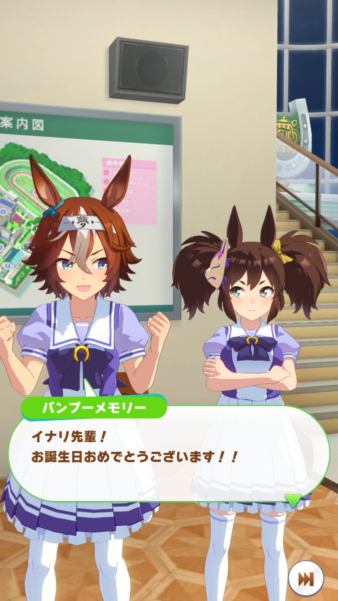 イナリの誕生日ホーム画面、やっぱり永世三強繋がりで、オグリとクリークでしたね。